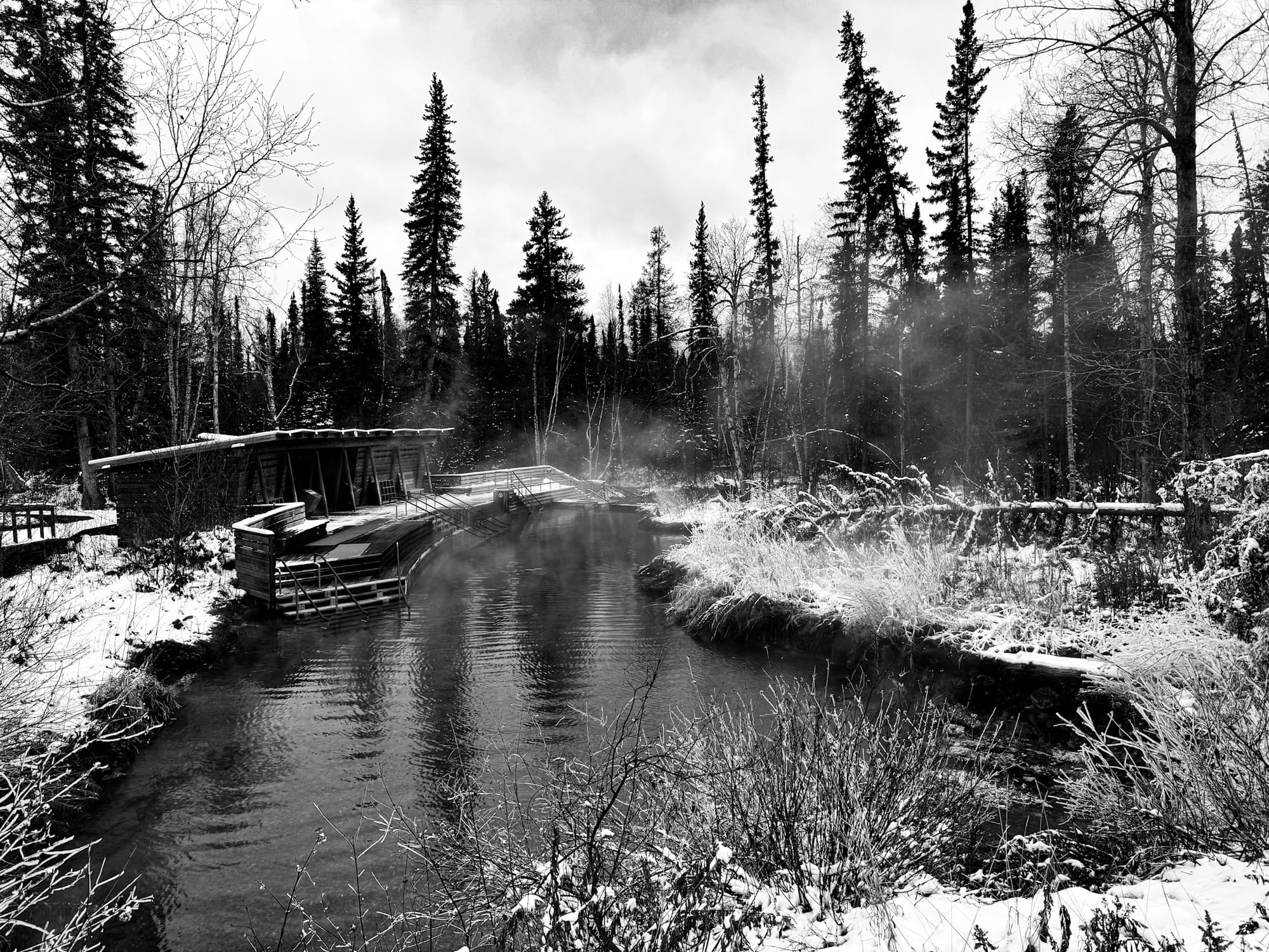 After getting through that slow stretch, you reach Watson Lake and the infamous Signpost Forest. We didn’t spend too much time there considering how cold it was, so we went to Andrea’s Hotel for some Filipino food. After a short break, it was back on the road towards Liard Hot Springs. It was slow going as the sun set, and we nearly hit a moose crossing the highway a few hundred metres from our lodge across from the springs.